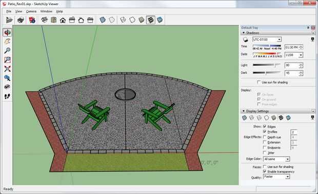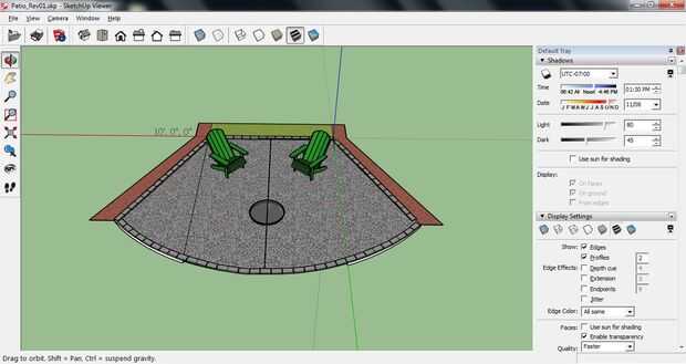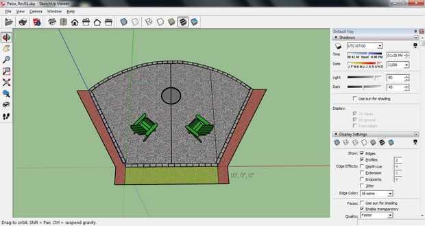 Usé la aplicación SketchUp para crear una representación del proyecto patio. Esto no es necesario pero es útil visualizar el proyecto y dar alguna idea aproximada de cuánto material (adoquines y piedra) necesita. La aplicación cuenta con alguna característica de cálculo de área pero tienes que ser muy precisos con las medidas.