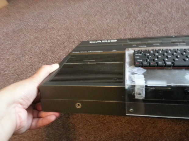 Esto tomó un tiempo. Después de averiguar de diseño donde quería mis puertos que, tuve que cortar con una dremel. También hay que fabricar una tapa para el funcionamiento interno no cubierto por el caparazón de teclado. optado por plexiglás simple. no necesitamos reforzar la carcasa, teclado de los años 80 muy robusto! añadido algunos biseles de plasticard para alisar sobre cortes burdos.