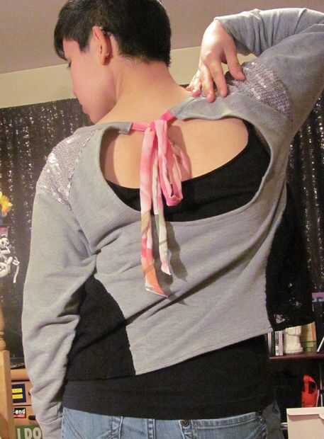 Para este proyecto tomé un viejo suéter y añadido algunos acentos lindos para convertirla en algo totalmente nuevo. Los cambios incluyen una espalda abierta con un marco y algunos cortes con volantes a los lados. Espero que disfruten haciendo este proyecto tuyo.