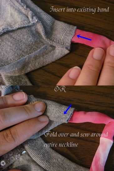 Mi suéter tenía una banda que, cuando se corta, se podía abrir, así que sólo cayó uno de los extremos de mi correa en esa apertura y cosido abajo. Si tu camiseta no tiene una banda como esta, se puede doblar el borde hacia abajo sobre la correa y luego tienes que doblar y coser todo alrededor del cuello.