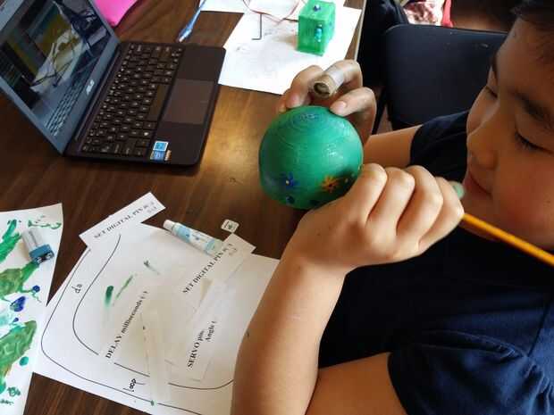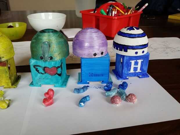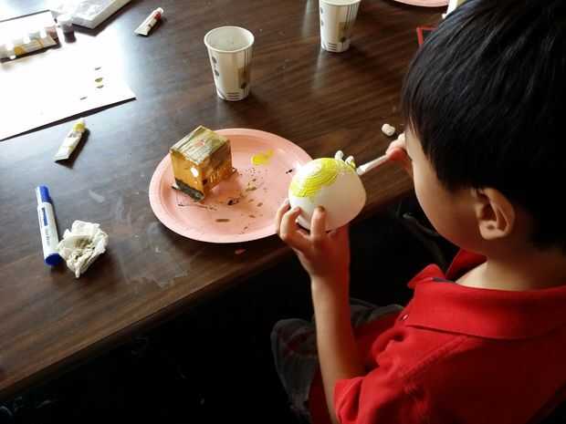 Ahora es tiempo para pintar su robot. Por lo general utilizamos pinturas acrílicas. Que los niños piensan acerca de cómo quieren su robot para ver antes de empezar a pintar. Este es un buen momento para introducir conceptos de diseño industrial.