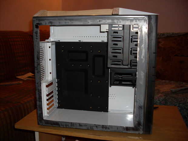 La pintura vienen generalmente por fin pero en este caso lo único que espera la pintura es la parte superior del lado de la caja de la PC. Después de cortar el lado para el vidrio el cuerpo principal está listo para pintar.