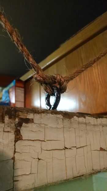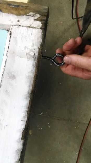 Instale el alambre o cuerda para colgar o usar cualquier método de hardware para colgar en tu pared. Utilizamos cuerda y ganchos de ojo porque cuelga de nuestro plafón al lado de la nevera.