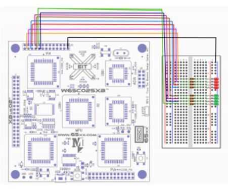 El esquema muestra la disposición física del circuito y su conexión con la Junta de W65C02SXB. En esta versión del circuito que utilizamos terminales periféricos W65C22 través de entrada-salida puerto B a la placa utilizando una conexión de alambre de 8. El lado positivo de cuatro LEDs (lleva más tiempo) se une a los pines 24-17 como se muestra. Los lados negativos de los LEDs están conectados a través de resistencias de 330Ω (aquí usamos un arreglo de resistencia) a tierra. Hay una barra vertical en la matriz de resistencia que indica el conductor común. Uno de los extremos de cada una de las resistencias de 330Ω en esta matriz se unen a este conductor. Cada uno de los otros conductores de la matriz de resistencia están conectadas a los otros extremos de las resistencias individuales.