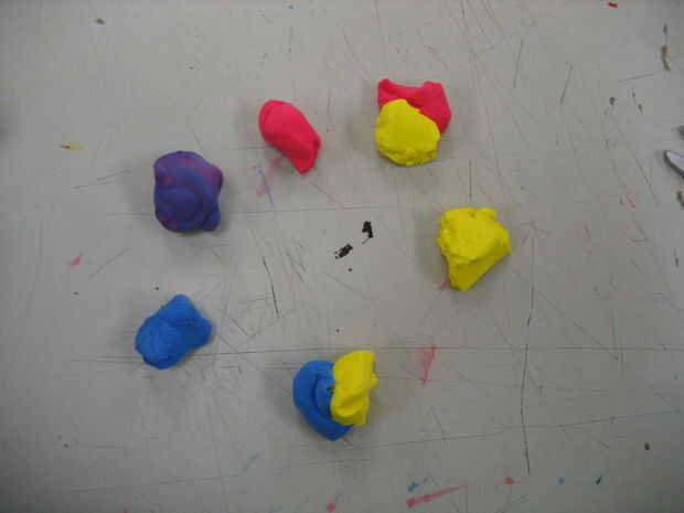 Empezar a mezclar arcilla... Pido a los estudiantes a predecir qué color va a hacer... rojo y azul hace morado