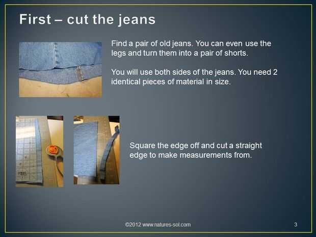 Se utilice ambos lados de los pantalones vaqueros. Necesita 2 piezas idénticas del material de tamaño.