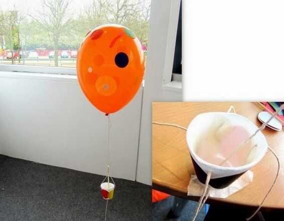 Con un pincho de bambú (palillo), los agujeros se hacen en los cuatro lados y en el centro de la parte inferior como se muestra en la imagen de arriba. Introduzca el hilo largo principal a través del orificio central de la Copa de espuma y cierren el agujero con una cinta adhesiva. Cuatro hilos de aproximadamente 2,5 pulgadas cada uno se inserta a través de los cuatro agujeros en los lados con un extremo pegado a la taza de la espuma y los otros extremos pegados al hilo principal que sostiene el globo (de aproximadamente 1 pie).-ver imagen de arriba