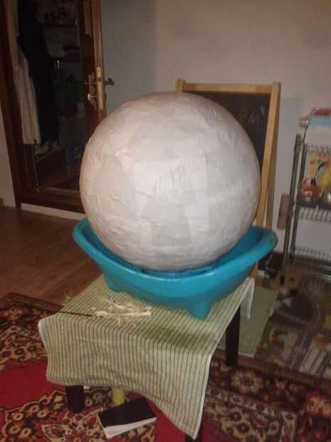 Usé una bola de la gimnasia en una bañera de bebé. Mezcla pegamento papel con agua. Recogida papel inútil y capas una por una. Mi inspiración vino de estos videos: