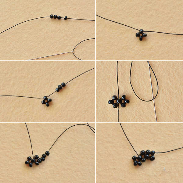 1 º, cortado a la longitud correcta de hilo de coser de nylon negro y deslice cuatro rocallas negras, luego cruzar el hilo de coser;