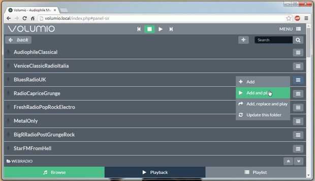 Desde aquí, puede haga clic en 'Examinar', 'Radio' y haciendo clic a la derecha de la estación, haga clic en 'Agregar y jugar' esto debería añadir a la lista de reproducción y comenzar a jugar, cambiar de orden o cuál es en, haga clic en la ficha 'Playlist' en la parte inferior, para cambiar el volumen haga clic en la tabla media 'Playback'.