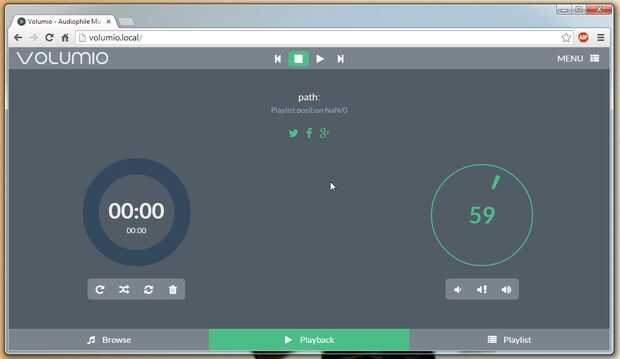Con él todo configurado, el Pi arrancado y conectado a la red, abrir una nueva pestaña en el navegador y probar uno de los siguientes 'http://volumio.local/' o 'volumio.local/' debe cargar una nueva página buscando algo como el de las imágenes de abajo.