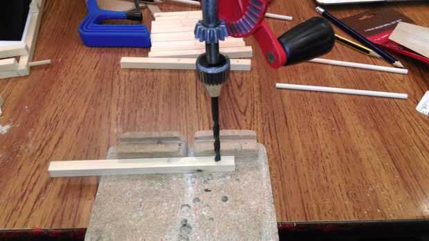 El tamaño de los orificios dependen del diámetro de su espiga redonda. He utilizado 5 mm redondo pasador, usé una broca para madera 5mm.