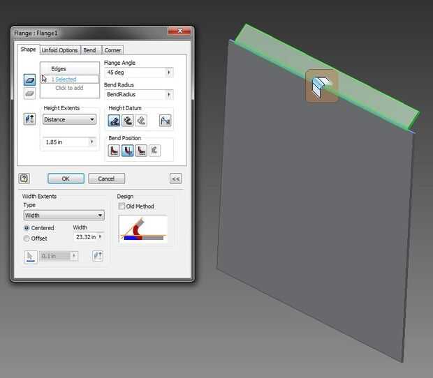 Añadir un centrado del reborde en el borde superior de la cara posterior, seleccione la flecha doble en la esquina inferior derecha de la pantalla de creación de pestaña para abrir el refinamiento adicional de tamaño y criterios de colocación de la brida.