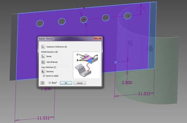 Utilice la función de "Voltear" para doblar la pieza a su estado en.