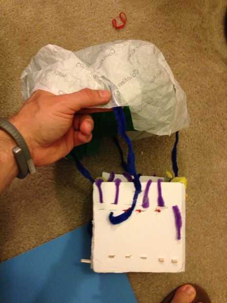 Nota: Asegúrese de que los cuatro limpiapipas se distribuyen uniformemente para que el paracaídas idealmente caerá directamente hacia abajo. Como un Consejo, ayuda a acortar la longitud vertical de los limpiapipas para asegurar que siguen siendo autodidacta y no causan distribución desigual del flujo de aire en paracaídas durante la caída. Además, el paracaídas por debajo es blanco en el exterior porque hice el paracaídas dos capas. La capa verde es por debajo de la capa blanca en un esfuerzo para crear más resistencia del aire.
