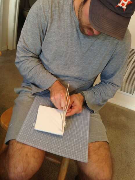 Cerca de la parte inferior de los cuatro lados de las bases de la base de espuma, fije dé los palillos de madera. La colocación de los palos debe coincidir con el lado de la base de espuma frente a él.