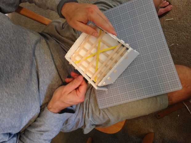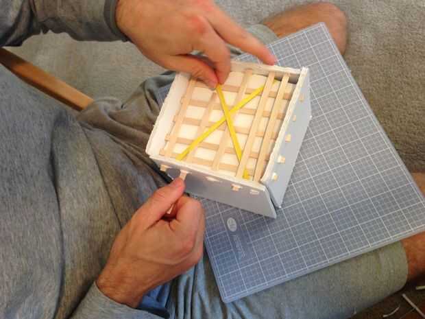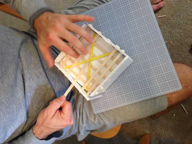 Ahora que la parte inferior de la base de la caja de la base de espuma tiene forma de X con la goma alrededor de la base de espuma, desate la media madera sitcks y tejen dentro y fuera de la goma. Este paso debe Asegúrese de que la caja ahora es una sola pieza.