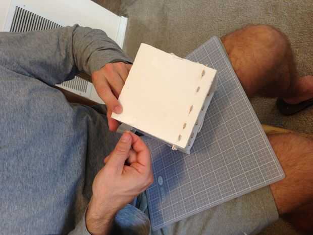 Uso la cinta scotch para adherirse a los cuatro lados de la base de la espuma. El objetivo de este paso es darle cierta estabilidad a la parte superior de la espuma lados de base para que queden una arriba de la pieza hacia abajo.
