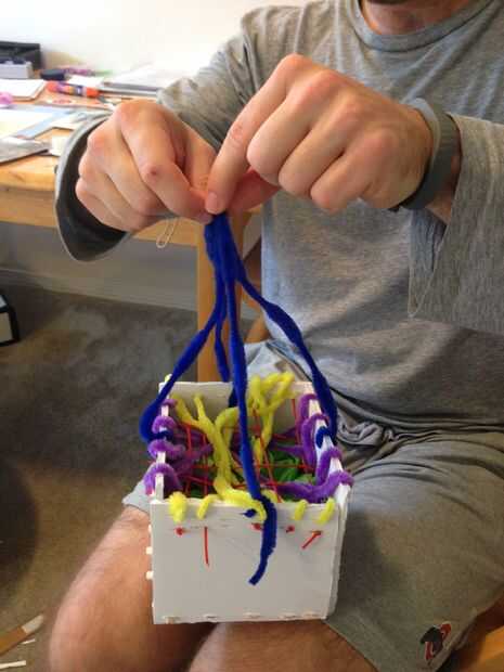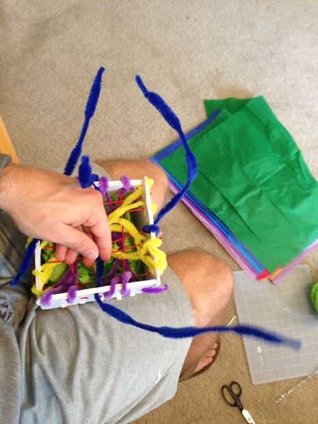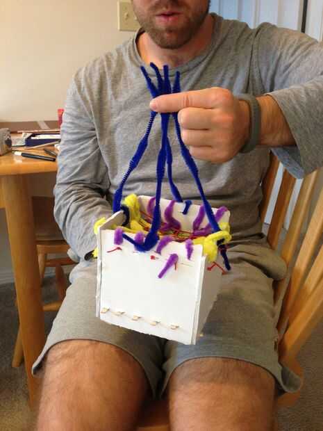 Use un cuchillo x-acto para cortar un agujero pequeño en cada uno de los lados de la cuatro caja. Pase un limpiador de pipa a través de cada agujero con la holgura resultante en el limpiador de tubos permitiendo el limpiador de pipa para soporte recto para arriba cada limpiador de pipa debe han una cantidad igual de flojo debido a se sujeta a un paracaídas que necesitará abrir uniformemente para arrastre (resistencia del aire).