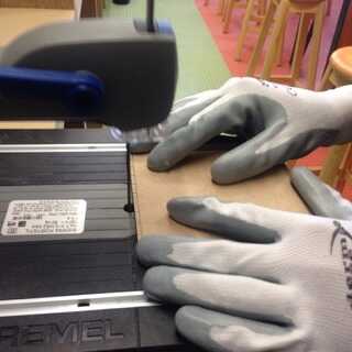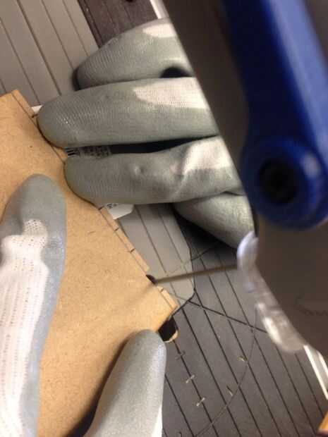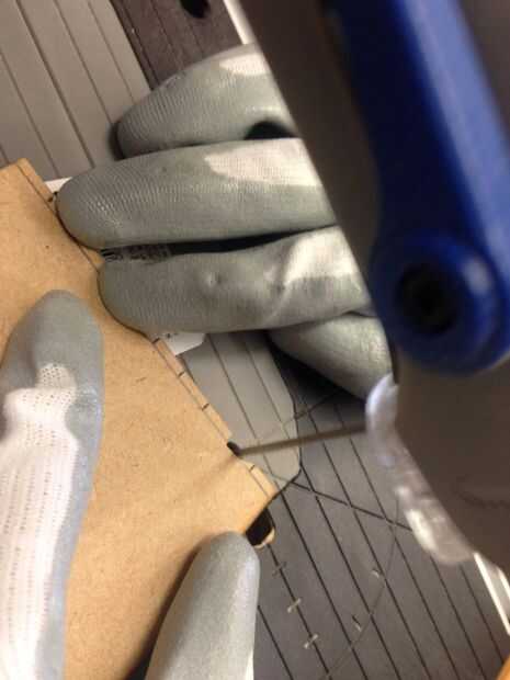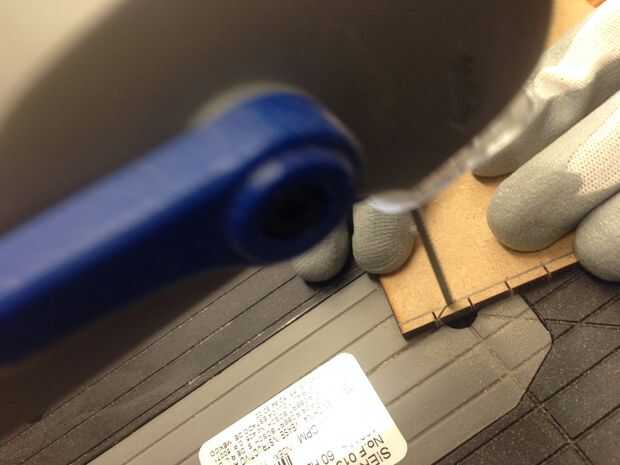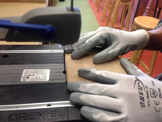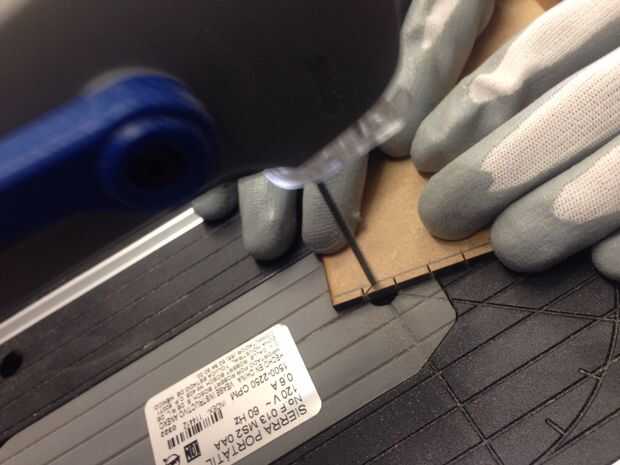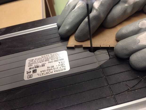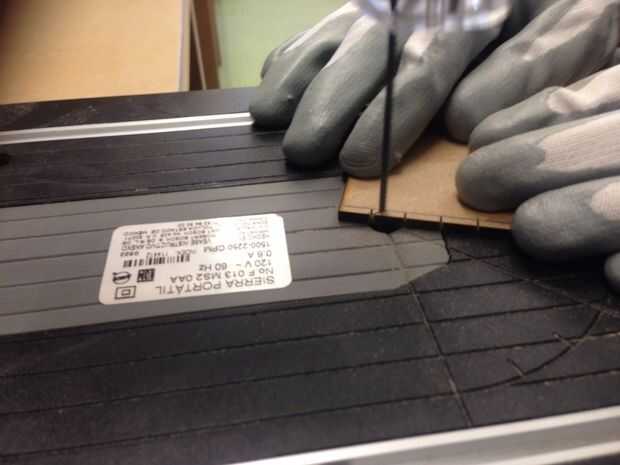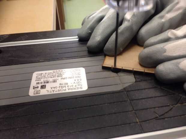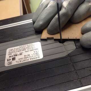 Enciende la MotoSaw y coloca de forma perpendicular a la sierra la cara de la placa tiene las marcas y corta los 3 mm de línea marcaste.