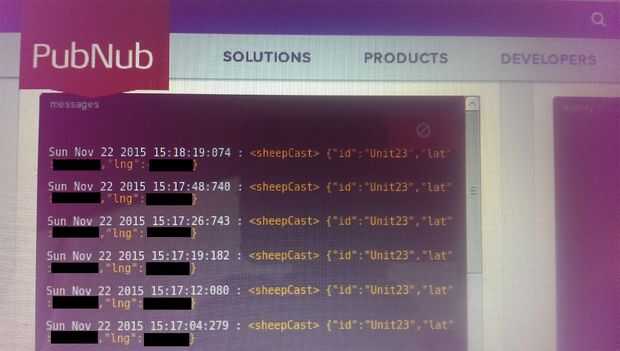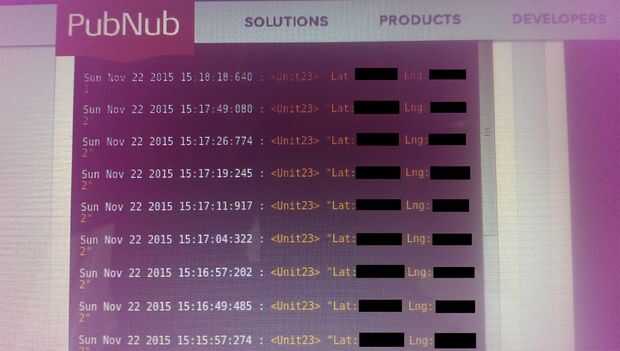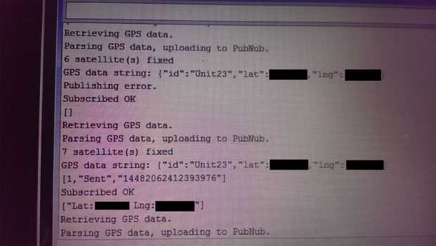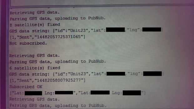 Las imágenes en este paso muestran pruebas de PubNub de etapa temprana: simplemente enviando el LatLng coordenadas hacia la unidad que les informaron. Salida serie imágenes muestran la naturaleza asincrónica de la secuencia de datos de PubNub en tiempo real, cualquier código de script tiene que ser capaz de manejar eso.