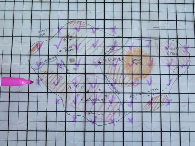 Usar una hoja cuadriculada para estimar el área mediante la superposición en la parte superior. Casillas de verificación que son más que lleno hasta la mitad de su isla y poner x en los no. Al final, contar el número total de casillas marcadas y su tasa de conversión, calcular el área total.