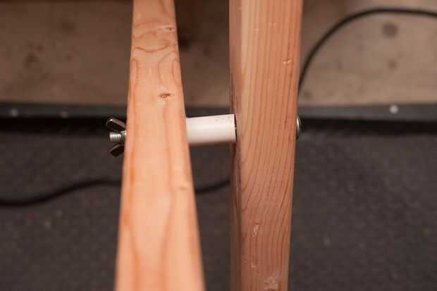 En las piernas, uno se coloca fuera y uno es dentro del marco, así que terminas con aproximadamente ~ 2" del espacio vacío en el medio, utilicé un trozo cortado de tubería de PVC para llenar ese espacio y proporcionan un ajuste perfecto cuando los pernos estén apretados.