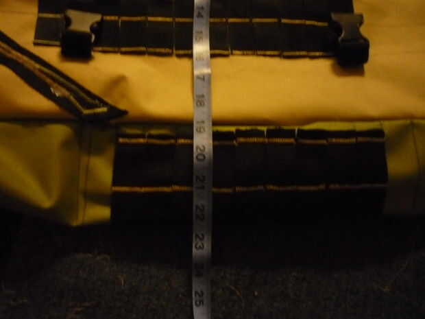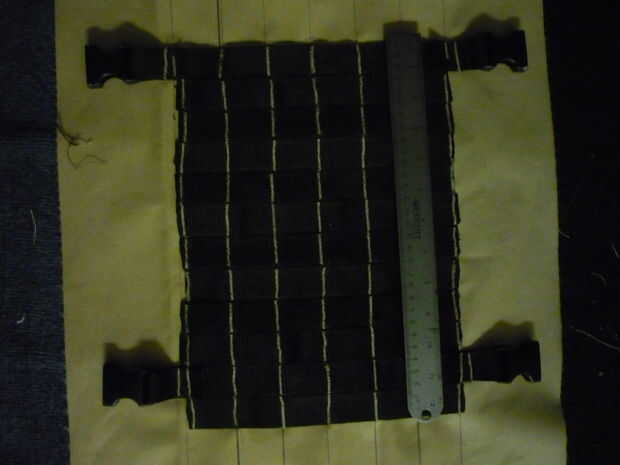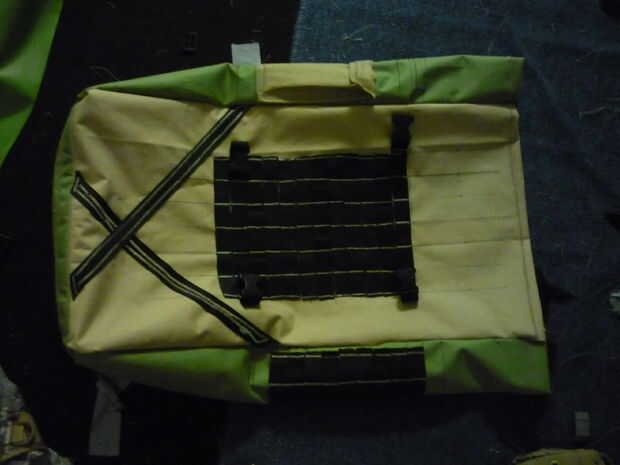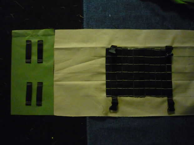 Básicamente hice 2 laterales (que mide 30 pulgadas de alto y 8 pulgadas de ancho), un frente y espalda (30 pulgadas de alto 20 pulgadas de ancho) y un fondo (20 pulgadas de ancho y 8 pulgadas de alto). Luego cosí las correas MOLLE en la pieza frontal y una de las piezas laterales. Después de he cosido todas las piezas juntas (revés) y límite los bordes. He volteado "interior derecho" y había unido al marco mediante hebillas predefinidos que. ¡ Disfrute!