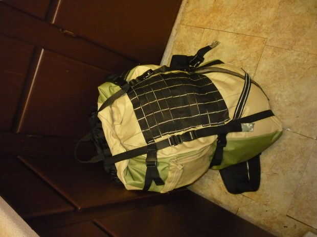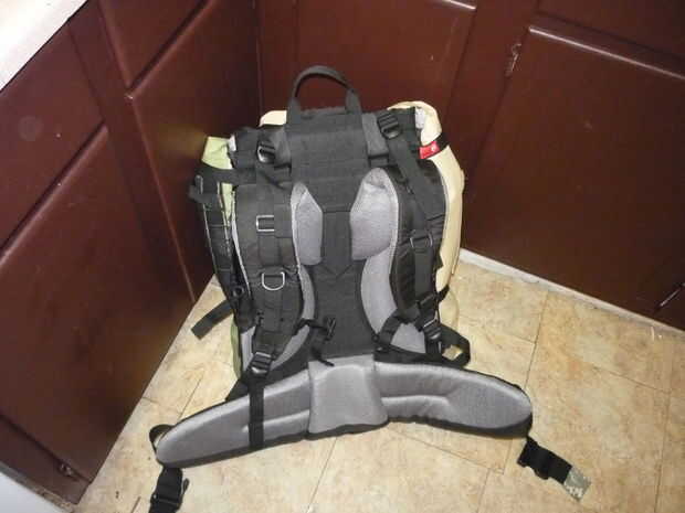 Una vieja mochila de 65L (de hombreras, almohadillas de riñón, correa de pecho y marco de aluminio interna)