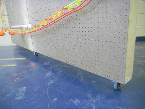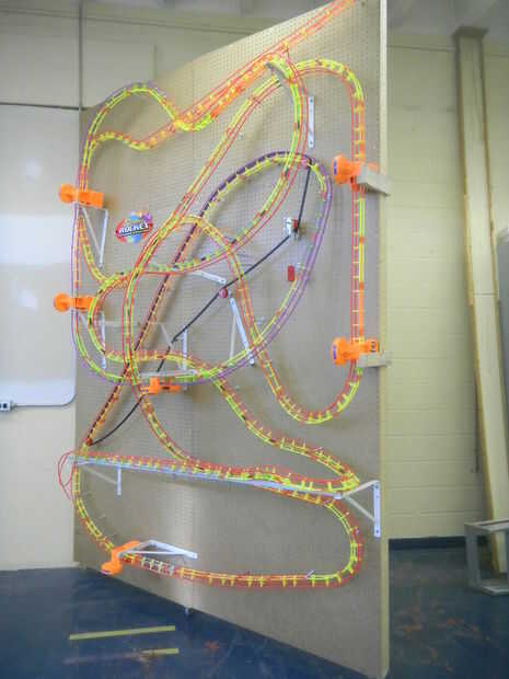 - La parte más difícil es realmente construir y diseñar el trazado de la pista. Toma tiempo y un montón de ensayo y error. Traté el tablero de clavija como un lienzo en blanco. Había iniciado en la parte superior y había trabajado mi manera hacia abajo. Cuando llegué a la parte inferior, tuve que averiguar la mejor manera de utilizar mis refuerzos para volver a la cima otra vez. Es realmente importante que los soportes grandes para que se pueden superponer las secciones de la pista.