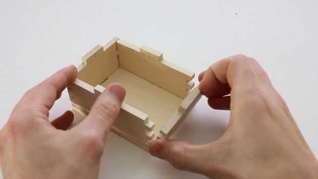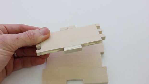 Para comenzar a pegar, aplicar una pequeña cantidad de pegamento para madera a todas las caras de conexión de una sola pieza de lado. Luego fíjela a la Junta del fondo. Lo mismo para cada una de las piezas laterales. Fije uno por uno a medida que avanza. Recuerda no pegar cualquier caras que harán contacto con el tablero superior. Una vez que el tablero inferior y los tableros laterales estén en su lugar, colocar en el tablero superior.