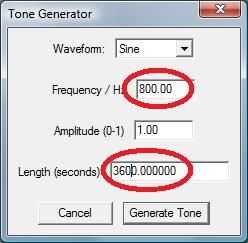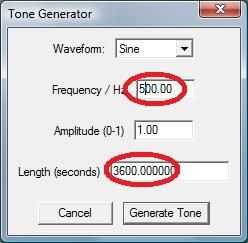 el tono. Cuando aparezca la ventana, cambiar la frecuencia a 800 Hertz y la longitud a 3600 segundos. Repetir, excepto este tiempo ajustar la frecuencia a 500 Hertz.