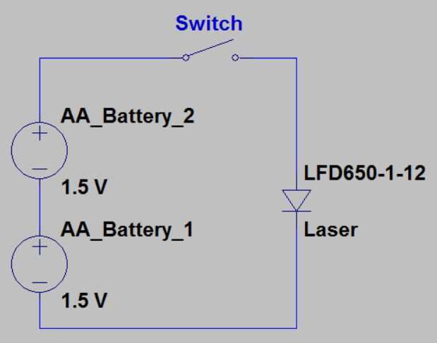 El cirquit es un laser de LDF650-1-12 en serie con dos pilas de 1,5 V AA.
