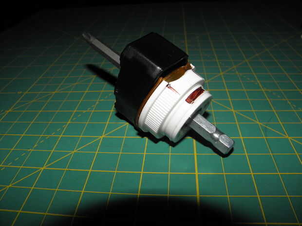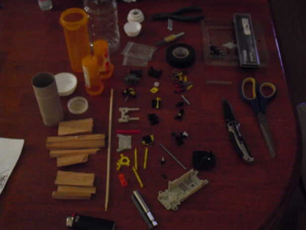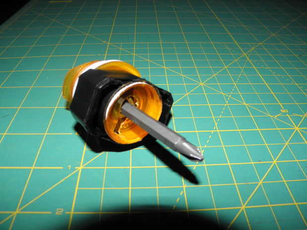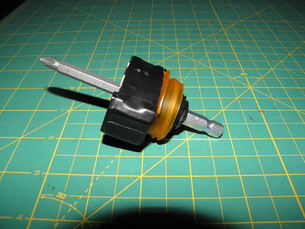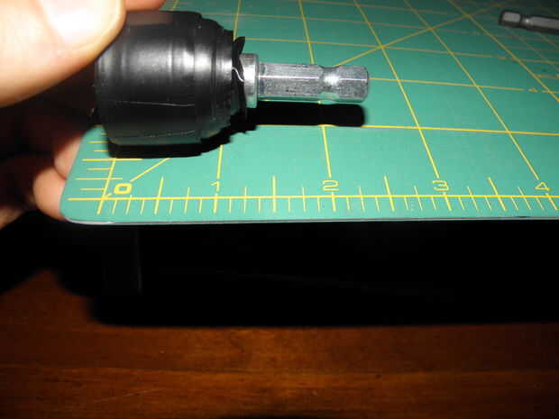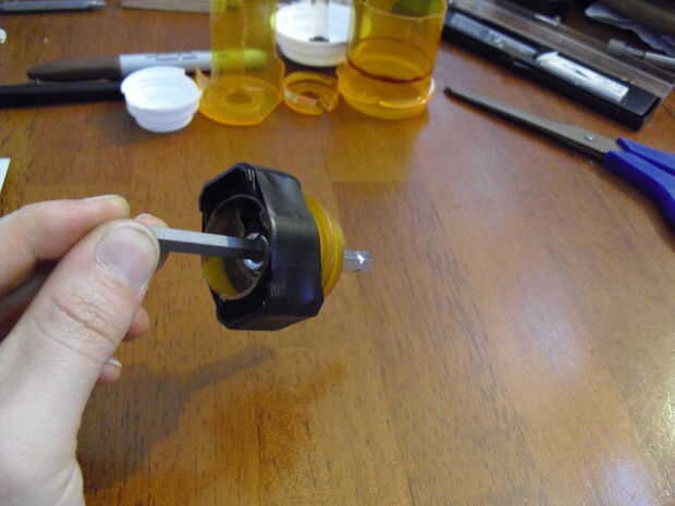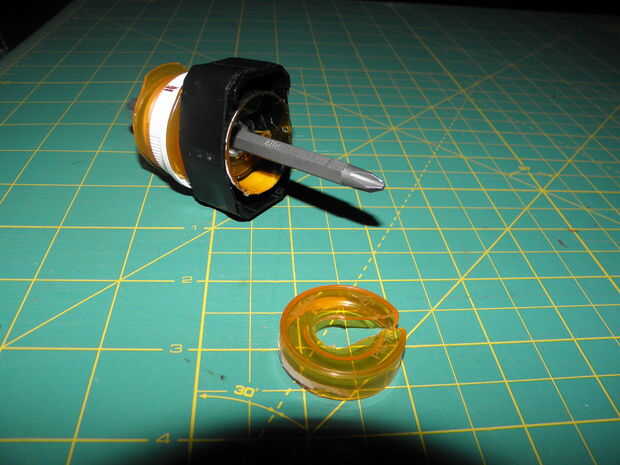 So this would be my first step to the project. No pienso tomar fotos hasta después de que empecé por lo que estoy pensando en volver y construir un segundo cojinete para mostrar cómo lo hice.  Primero tomé mi sostenedor del pedacito y cuando fui a la tienda sólo miré para un rodamiento para caber comodamente el diámetro de la titular de bits. Entonces lo envolvió en cinta aislante por lo que encajaría cómodamente en el housing(pic#3) que hice. Una vez que había descubierto la caja y tenía guías a cada lado para una parte más adelante. Tuve que colocar un tapón y también algo que encaje en el frente y sostener la broca y rodamientos dentro de la vivienda. (cuadro #6 y 7) Acumular basura aleatoria y viejas botellas de la píldora de la gente para el proyecto y las tapas de cierre en las botellas y reversas roscas en este proyecto mucho más fácil que también usé tornillos pequeños de un rasgó abajo R/C coche.