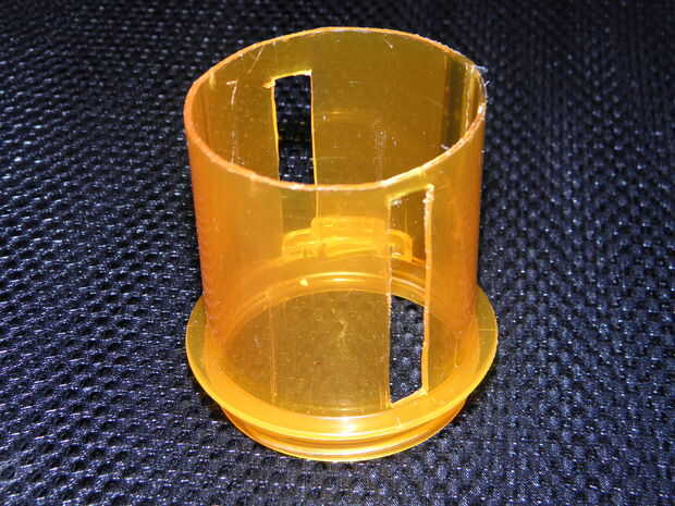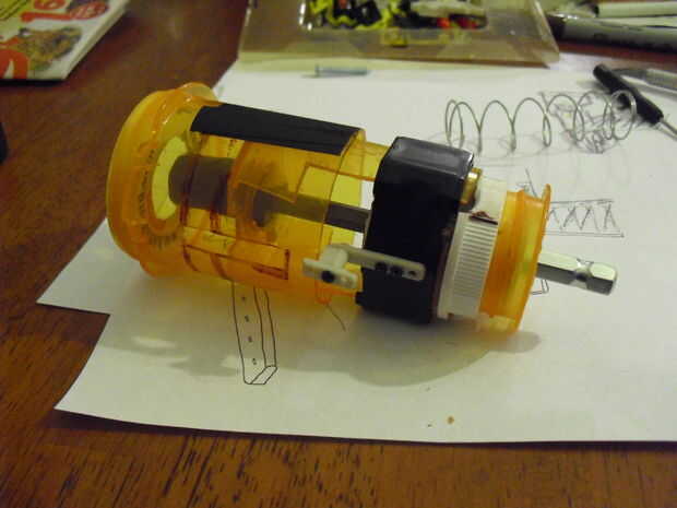 Siguiente era encontrar una manera para que la base para moverse pero no empuje hacia la parte posterior de la cáscara cuando el resorte se encuentra dentro. Así que ahora me dirijo al azar R/C coche piezas y piezas poco prefabricadas podría utilizar. Y por supuesto no he podido encontrar dos piezas idénticas para mantener mi base y la cáscara externa juntos así que tuve que fabricar 2 piezas diferentes para mantenerlos juntos y montar la pista para mantener la cáscara y el núcleo juntos.