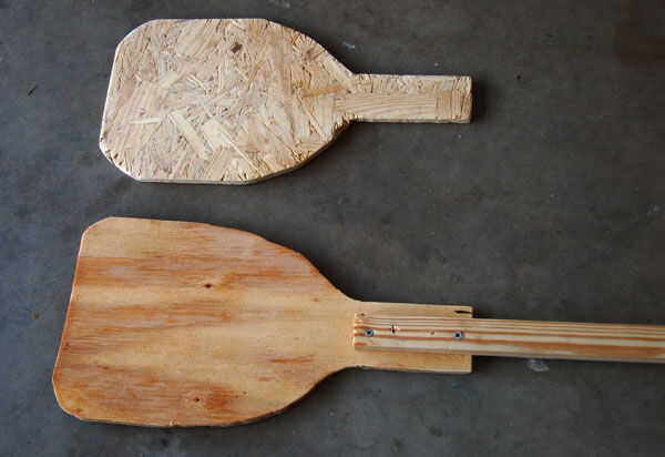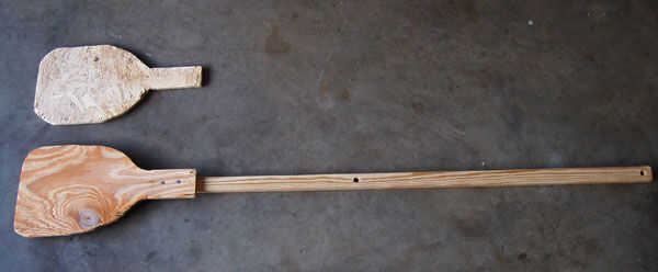 Un viaje rápido a la sección de madera de desecho en Home Depot me consiguió un poste de madera y un pedazo de madera contrachapada para hacer una paleta de. La madera me cuesta $1,50. Trazar una forma de paleta sobre la madera contrachapada y cortar con su elección de sierras. Usé una sierra circular. Ambos de la arena y el poste abajo lisa y con bordes redondeados para atornillarlos. No tarda mucho, pero son robustas y eficaces. Definitivamente hay que sellarlos con algo. Estoy pensando colocar una botella de agua para la flotabilidad, en el caso de caigan en el agua.