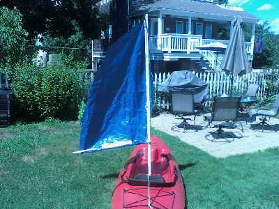Mi primera no tuvo éxito. Tenía un mástil de PVC de 4 pies en el orificio de drenaje. Tenía a cada lado de la vela de lona con la cuerda.