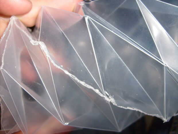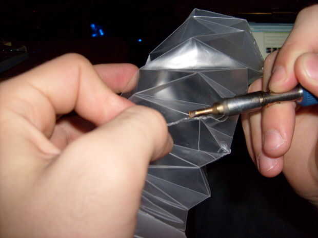 Con el soldador en la mano, intentar pellizcar el cilindro de manera que queden alineados los bordes de la costura. Hacer esto para un panel a la vez, o que va a ser prácticamente imposible alinear. Con la punta de cincel de hierro, correrlo hacia abajo los bordes tocando para fusionarlos juntos. Esto se convierte esencialmente en una línea de pliegue. Hacerlo todo el camino, y el cilindro debe terminar con una espiral, costura de zigzag que actúa como una montaña doble línea. Ahora para agregar la parte superior e inferior...