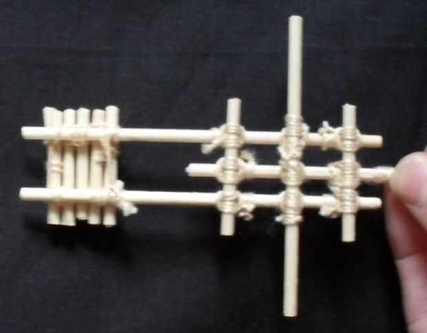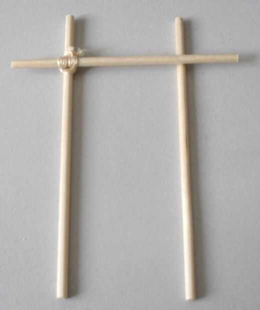 En primer lugar yo empezaría como en el ultimo paso, mediante la construcción de la sección media, esto es el crucifijo como bit donde usted coloque una pieza vertical de madera, en su pivote que va a ser en el plano vertical (o cualquier forma redonda te apetece jeje)