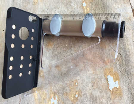 La idea es pegar las piezas en una disposición rígida y sólida. Debe fijarse el ángulo entre el ocular y el teléfono. Trate lo más posible para mantener el ángulo recto entre el ocular y la caja del teléfono, para que el teléfono y el ocular apuntan en la misma dirección (es decir, el eje del visor es paralelo al eje Z del teléfono). Esto es muy difícil de hacer a la perfección y un eje pequeño error es aceptable. (conocido por los navegantes como error de índice). Puede ser corregido más adelante en los cálculos.