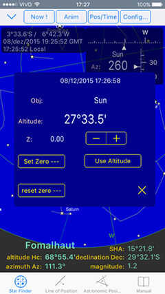 Con sextantes convencionales, la altitud se mide entre la estrella y el horizonte del mar. El sextante de iphone utiliza giroscopio electrónico del teléfono como referencia. Punto ocular y centro de la Cruz en el objeto de destino. Asegúrese de que la imagen es estable y Marque la altitud (usando el navegador de la aplicación, la altitud es capturada por golpear ligeramente el panel de actitud)