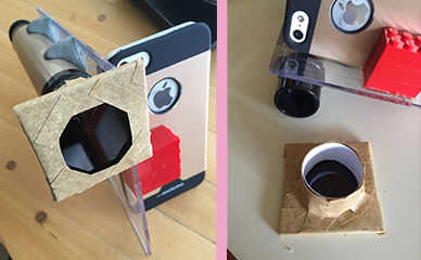 El adaptador de pantalla a la punta del ocular se hizo con el anillo de papel y cinta de embalaje (solución lame).