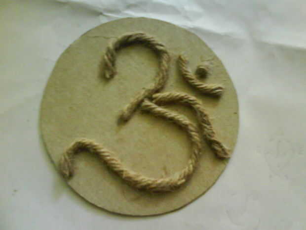 Mientras que el anillo y las llamas se están secando, permite hacer el pedazo de centro. Para hacer el símbolo de OM, usé yute y había pegado en la pieza central.