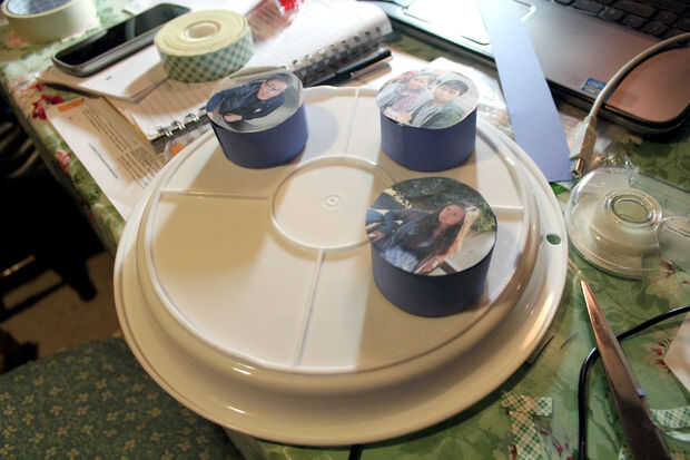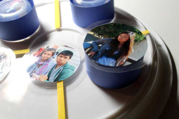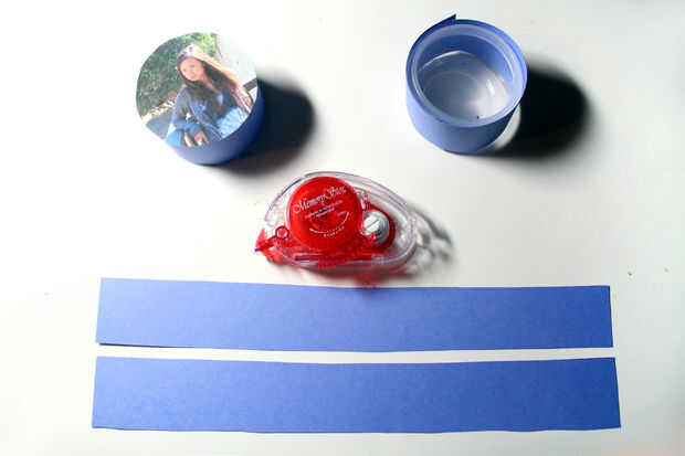3. Cortar papel de construcción (elija cualquier color que te gusta) por lo que envuelve alrededor de los contenedores de LED en los lados. Luego, coloque su foto en la parte inferior del envase de LED con cinta adhesiva o pegamento.