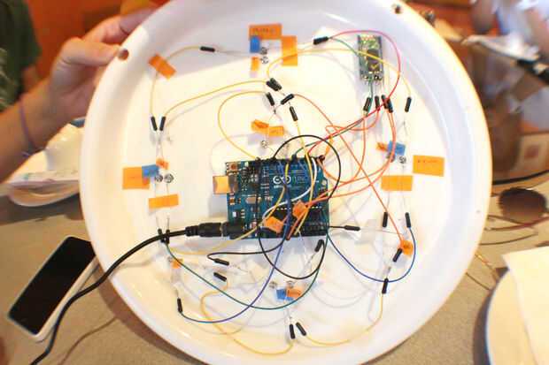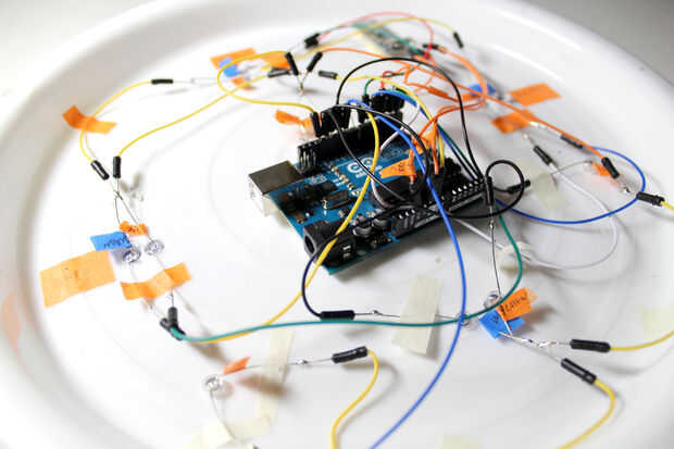 Me olvidé de comprar tableros de circuito en blanco, por lo que mi configuración actual parece un completo desastre. Básicamente había soldado los extremos de los cables de puente a los extremos de los LEDs. Lección aprendida. Pero bueno, funciona!