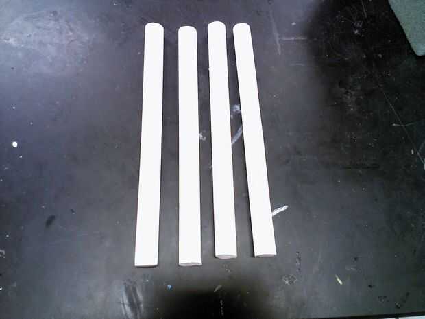 Corte cuatro pasadores de ancho madera de 0,5 pulgadas por lo que son 6,5 pulgadas de largo.