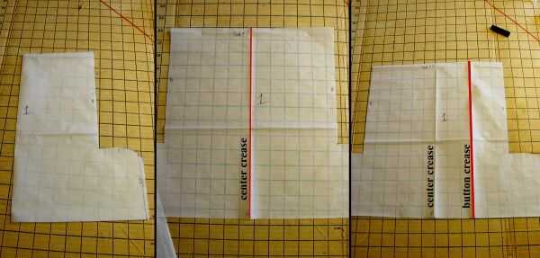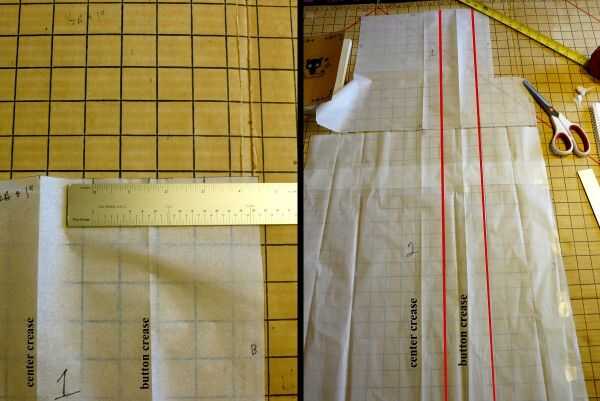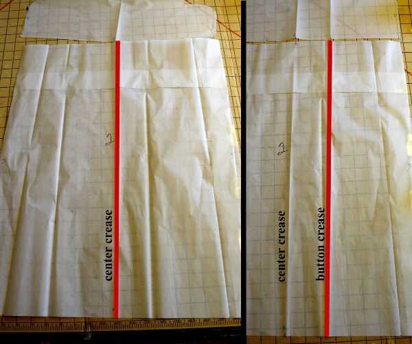 A la izquierda y derecha del botón pliegue en dos piezas ("cuello" y "atrás"), medida a 1-1/2" de pliegue en la parte superior e inferior; marca; Conecte estas marcas trazando líneas verticales.