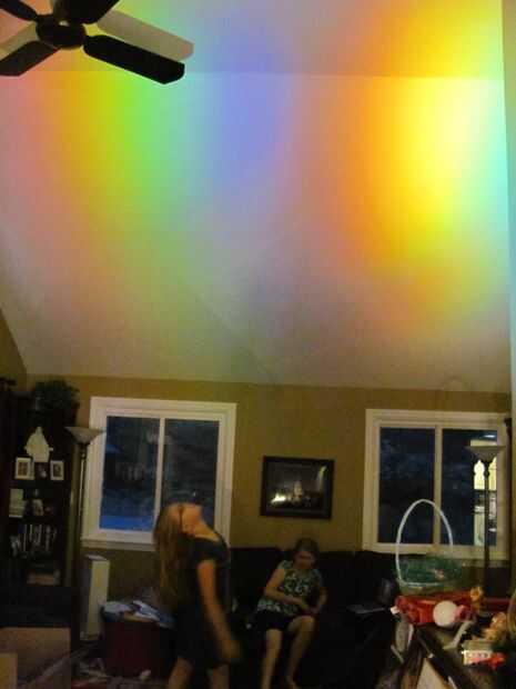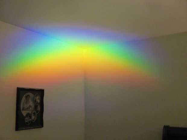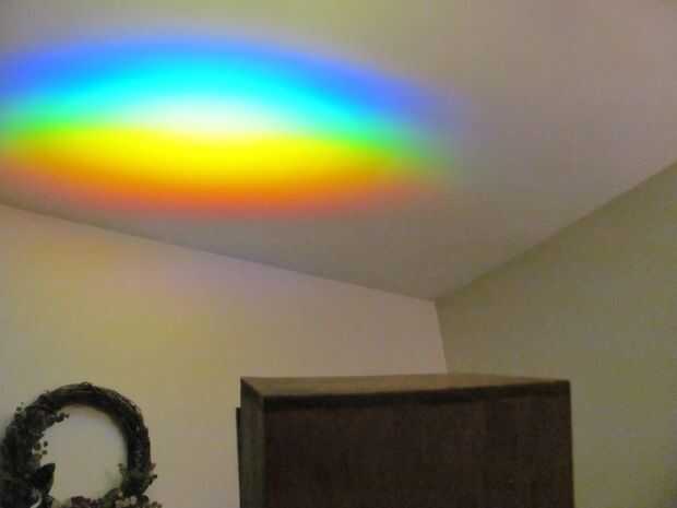 El proyector de arco iris está hecho! Ahora puede disparar para arriba y ducha su paredes y el techo con los colores del arco iris. El proyector está diseñado para funcionar verticalmente sentado sobre una superficie plana, pero puede ser inclinado en su lado si lo desea. La orientación vertical pretende mantener el LED de funcionamiento de lámpara tan fresco como sea posible - no tanto para asegurar que hay peligro de incendio y también a prolongar la vida útil de la lámpara LED, como luces de refrigerador duran más.