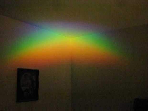 Sin embargo, para 'corregir' este 'error' planeo colocar un espejo de acrílico a la ventana de salida para que los colores se pueden proyectar en el techo en el orden correcto. El espejo también tendrá cierta flexibilidad de ajuste para que sea más fácil apuntar el arco iris donde usted lo desee.