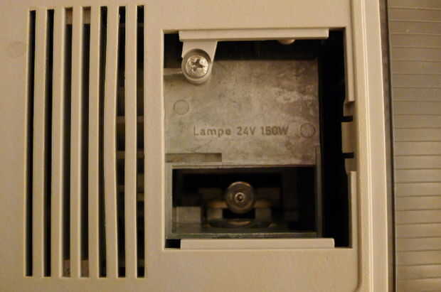 La base de la reconstrucción es sustituir 150 W (24 V, 4500 lúmenes) bulbo de halógeno de 14 W (12 V, luz 205) bulbo de halógeno. Inicialmente el plan era utilizar un potente LED en su lugar, pero esto no funciona bien. La luz muy concentrada, potente y uniforme que proporciona una lámpara halógena es clave para crear un efecto luminoso agradable con un proyector de diapositivas.